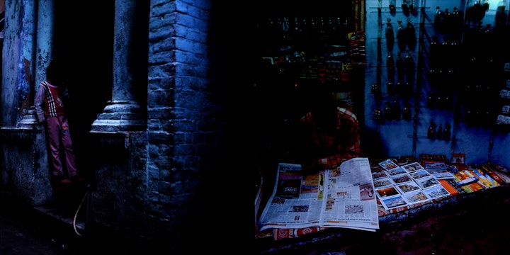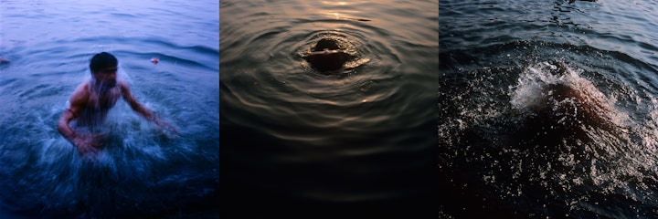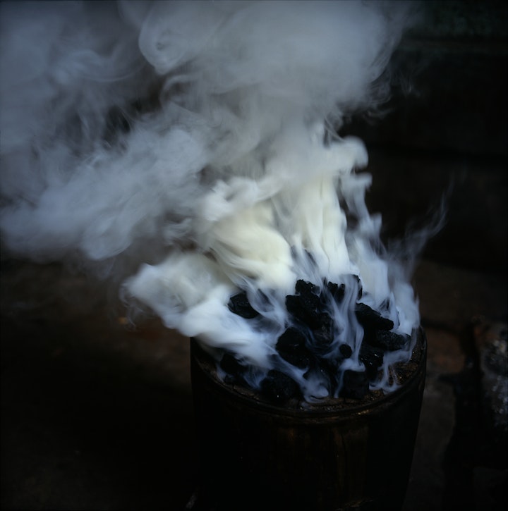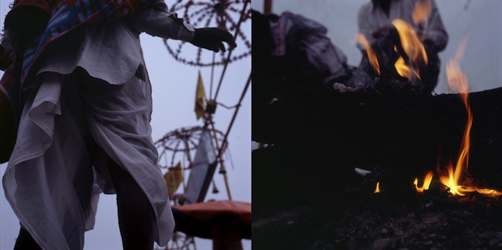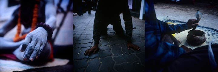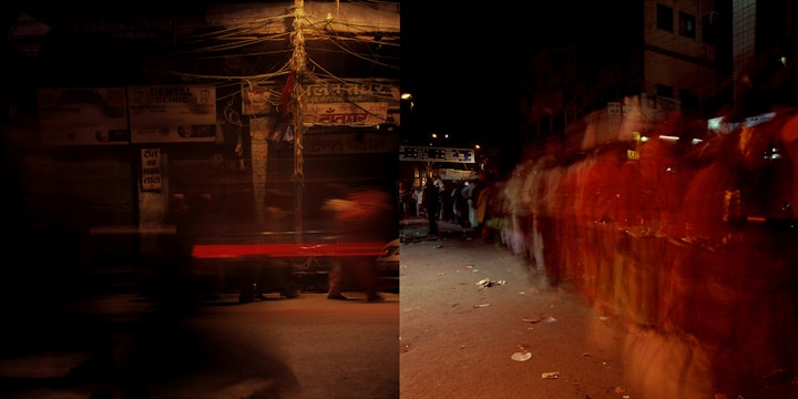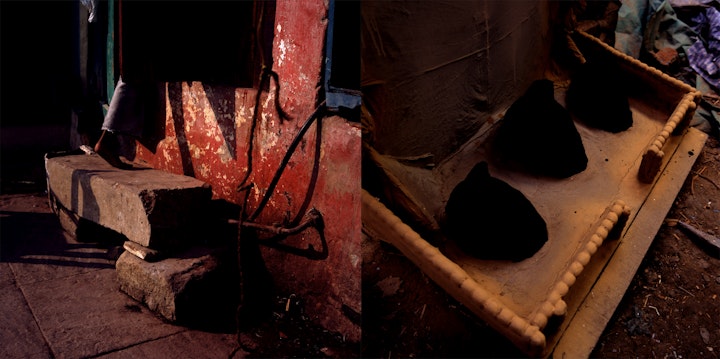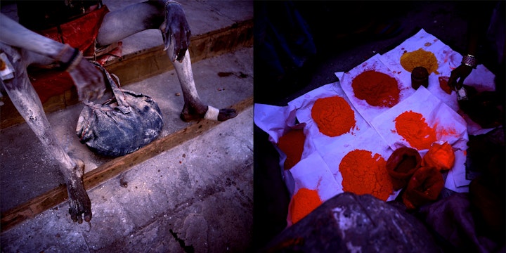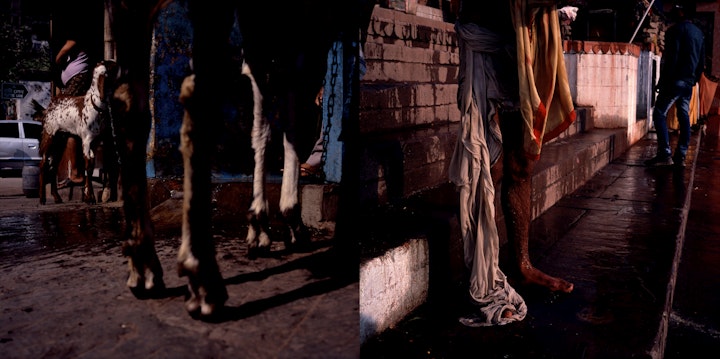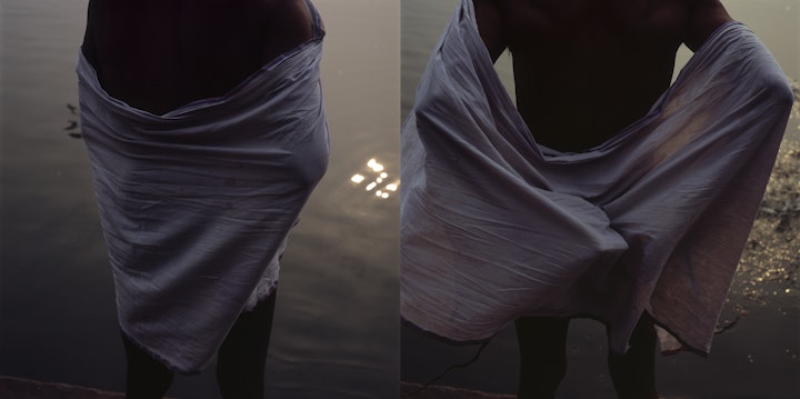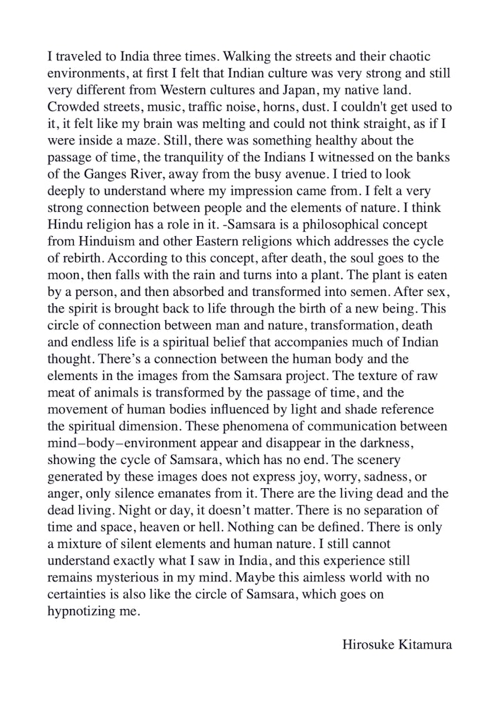 I traveled to India three times. Walking the streets and their chaotic environments, at first I felt that Indian culture was very strong and still very different from Western cultures and Japan, my native land. Crowded streets, music, traffic noise, horns, dust. I couldn't get used to it, it felt like my brain was melting and could not think straight, as if I were inside a maze. Still, there was something healthy about the passage of time, the tranquility of the Indians I witnessed on the banks of the Ganges River, away from the busy avenue. I tried to look deeply to understand where my impression came from. I felt a very strong connection between people and the elements of nature. I think Hindu religion has a role in it. -Samsara is a philosophical concept from Hinduism and other Eastern religions which addresses the cycle of rebirth. According to this concept, after death, the soul goes to the moon, then falls with the rain and turns into a plant. The plant is eaten by a person, and then absorbed and transformed into semen. After sex, the spirit is brought back to life through the birth of a new being. This circle of connection between man and nature, transformation, death and endless life is a spiritual belief that accompanies much of Indian thought. There’s a connection between the human body and the elements in the images from the -Samsara project. The texture of raw meat of animals is transformed by the passage of time, and the movement of human bodies influenced by light and shade reference the spiritual dimension. These phenomena of communication between mind – body – environment appear and disappear in the darkness, showing the cycle of Samsara, which has no end. The scenery generated by these images does not express joy, worry, sadness, or anger, only silence emanates from it. There are the living dead and the dead living. Night or day, it doesn’t matter. There is no separation of time and space, heaven or hell. Nothing can be defined. There is only a mixture of silent elements and human nature. I still cannot understand exactly what I saw in India, and this experience still remains mysterious in my mind. Maybe this aimless world with no certainties is also like the circle of Samsara, which goes on hypnotizing me.