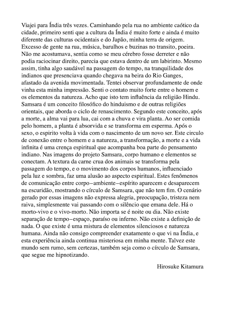 Nas imagens do projeto Samsara, corpo humano e elementos se conectam. A textura da carne crua dos animais se transforma pela passagem do tempo, e o movimento dos corpos humanos, influenciado pela luz e sombra, faz uma alusão ao aspecto espiritual. Estes fenômenos de comunicação entre corpo – ambiente – espírito aparecem e desaparecem na escuridão, mostrando o círculo de Samsara, que não tem fim. O cenário gerado por essas imagens não expressa alegria, preocupação, tristeza nem raiva, simplesmente vai passando com o silêncio que emana dele.